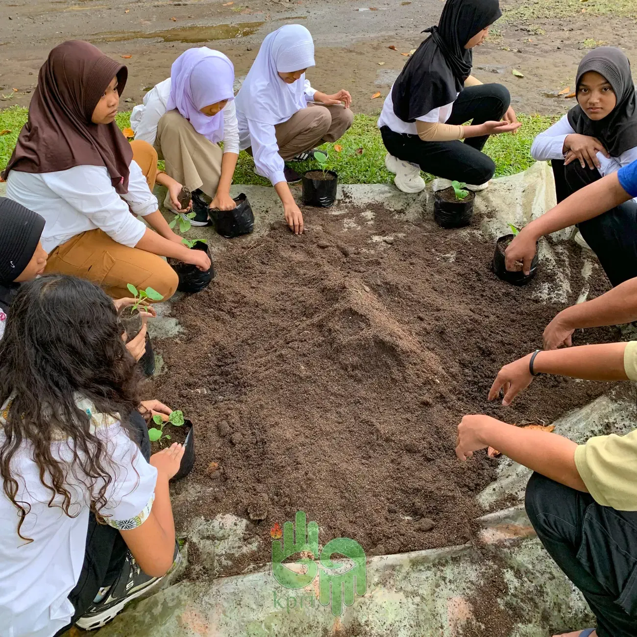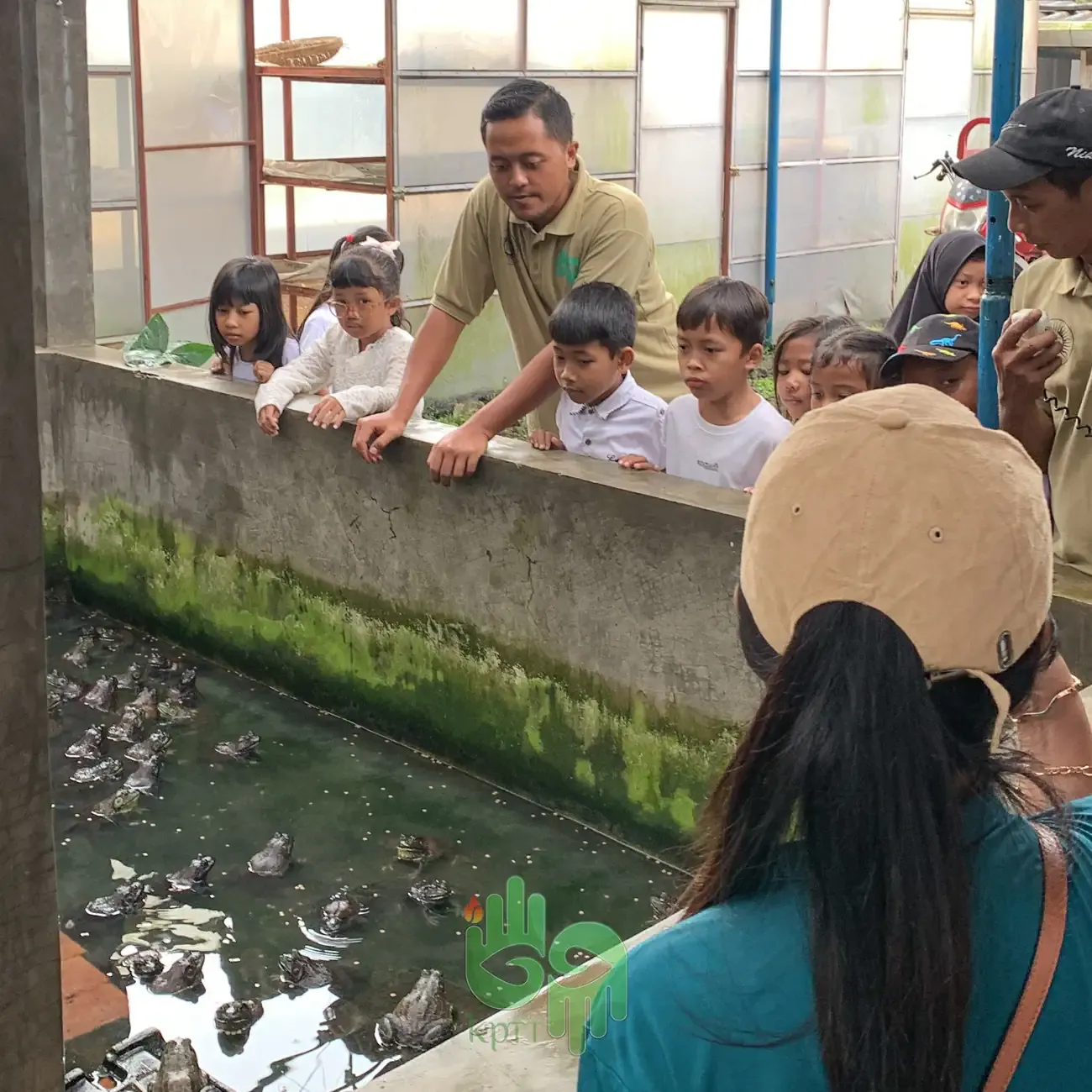 Agenda hari itu dimulai dengan Field Trip Area 1, dipandu mentor berpengalaman: Willy, Adven, Dimas, Agus, Fatah, dan Anton, plus volunteer Mikael, Lucky, dan Vena. Anak-anak diajak masuk ke greenhouse untuk melihat berbagai bibit yang sedang dirawat. Kemudian ada juga kelompok yang sedang menerima penjelasan tim KPTT di rumah budidaya jamur, memberi pakan ternak di kandang sapi, kandang babi, serta melihat bagaimana budidaya ikan dan katak kerbau untuk konsumsi. Setiap titik menghadirkan fakta unik: beternak babi organik dengan pakan ramah lingkungan, teknik budidaya jamur dalam kantong serat, dan menjaga kualitas air kolam ikan yang mengajarkan ekosistem terpadu. Kemudian, sesi yang paling ditunggu adalah sesi overplanting—para siswa memindahkan bibit tomat dan cabai ke media tanam baru, mencampur tanah, pupuk, dan pasir sambil belajar ilmu pertanian secara praktis.