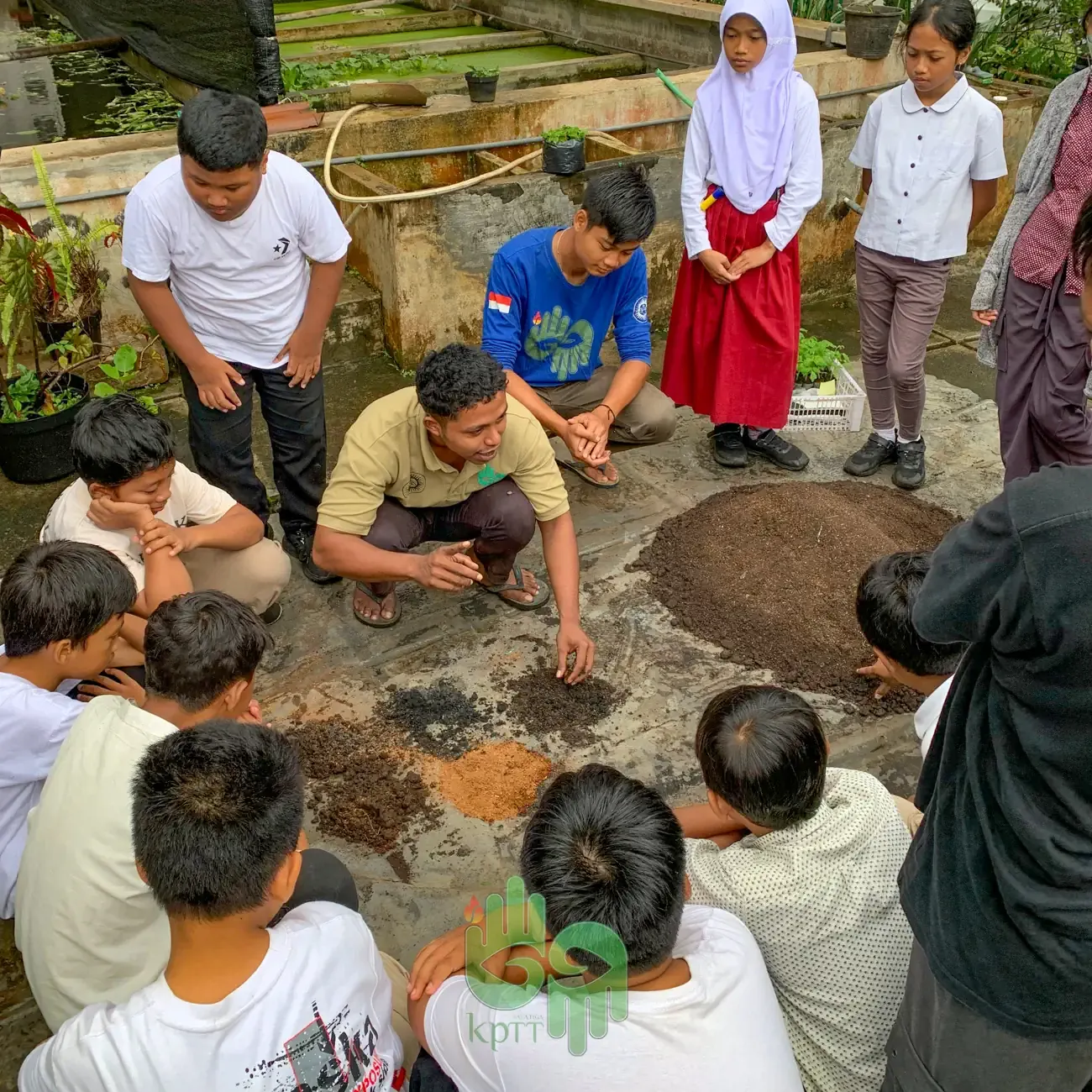 Agenda hari itu dimulai dengan Field Trip Area 1, dipandu mentor berpengalaman: Willy, Adven, Dimas, Agus, Fatah, dan Anton, plus volunteer Mikael, Lucky, dan Vena. Anak-anak diajak masuk ke greenhouse untuk melihat berbagai bibit yang sedang dirawat. Kemudian ada juga kelompok yang sedang menerima penjelasan tim KPTT di rumah budidaya jamur, memberi pakan ternak di kandang sapi, kandang babi, serta melihat bagaimana budidaya ikan dan katak kerbau untuk konsumsi. Setiap titik menghadirkan fakta unik: beternak babi organik dengan pakan ramah lingkungan, teknik budidaya jamur dalam kantong serat, dan menjaga kualitas air kolam ikan yang mengajarkan ekosistem terpadu. Kemudian, sesi yang paling ditunggu adalah sesi overplanting—para siswa memindahkan bibit tomat dan cabai ke media tanam baru, mencampur tanah, pupuk, dan pasir sambil belajar ilmu pertanian secara praktis.