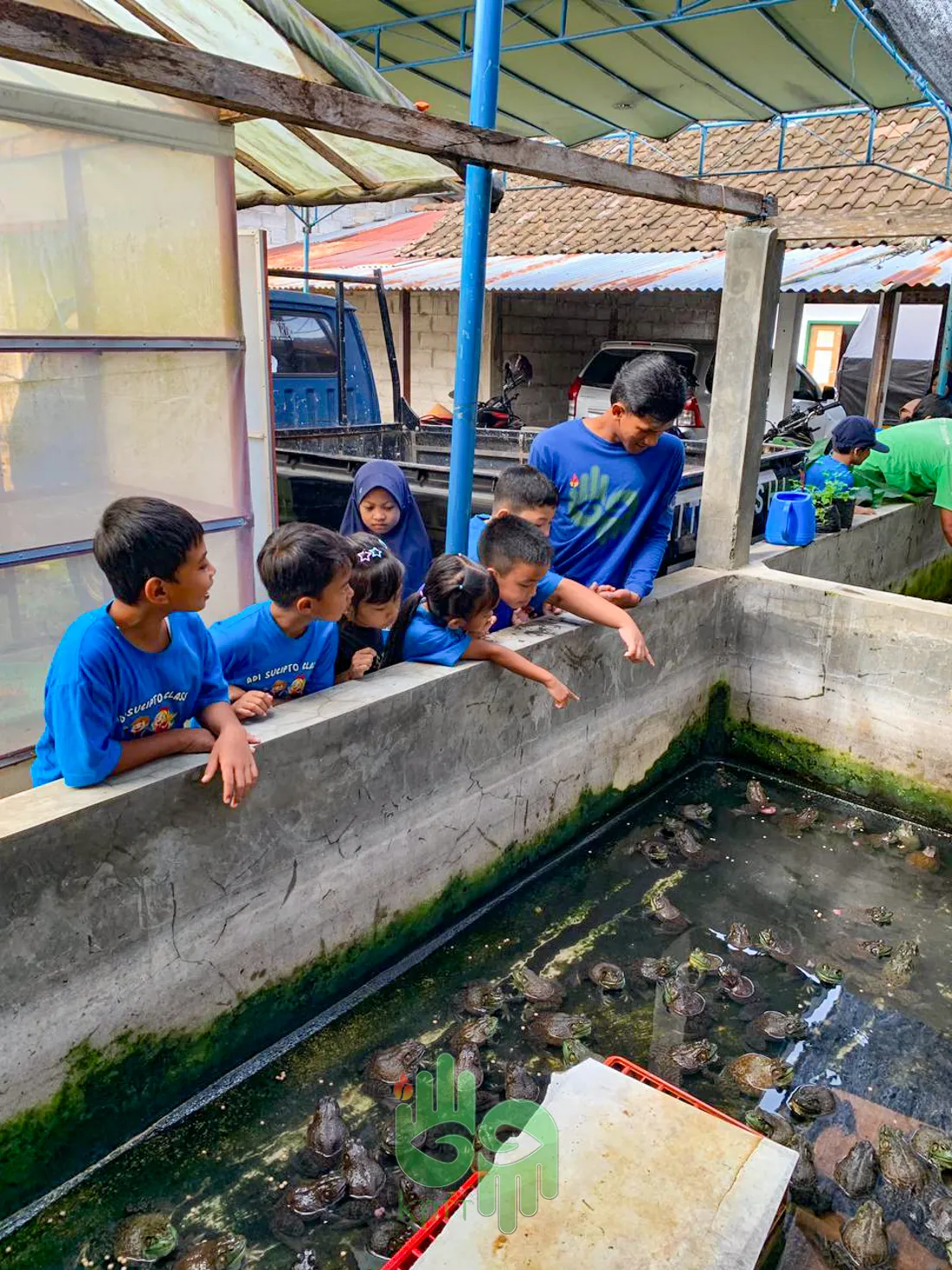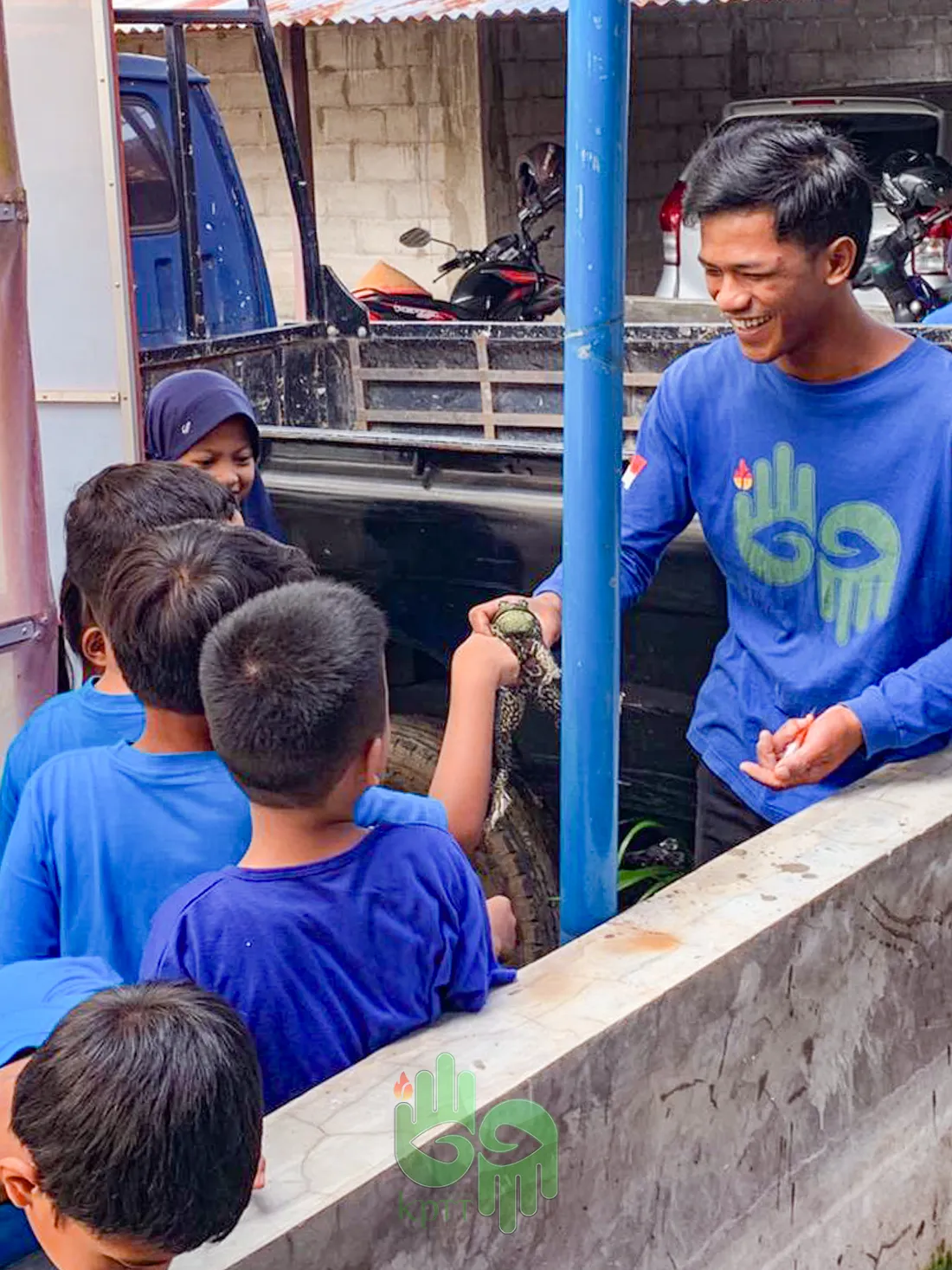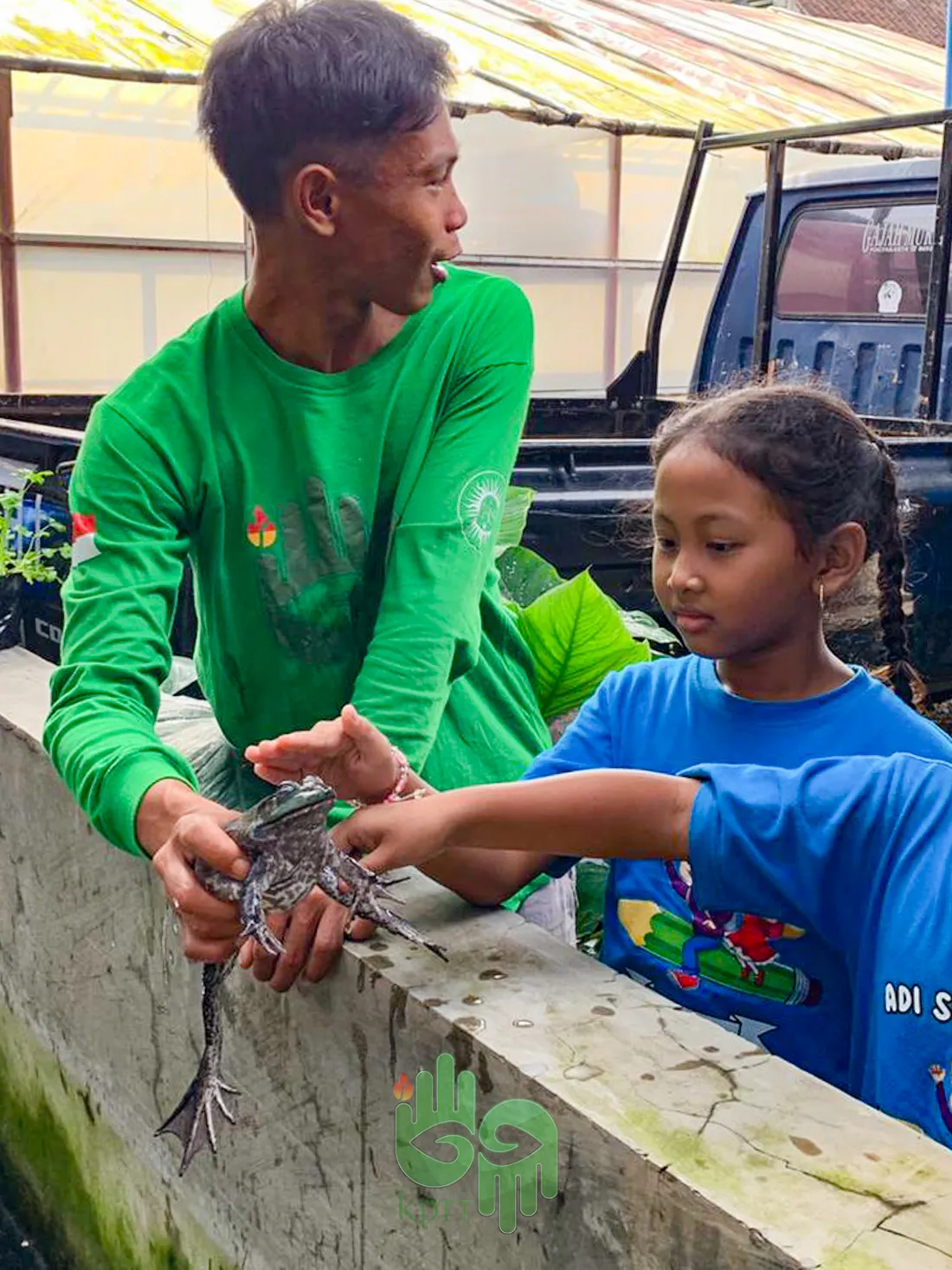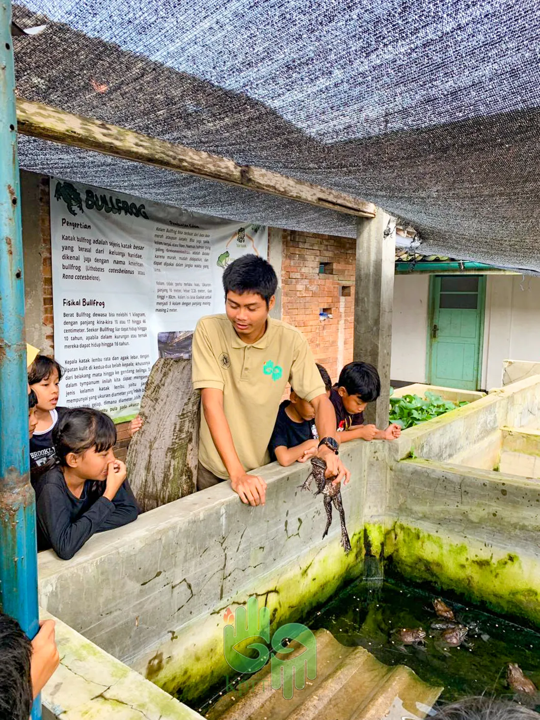 Ketika sampai di pos kolam bullfrog, reaksi anak-anak beragam—ada yang penasaran, ada yang takut menyentuh, tapi beberapa justru berani mencoba. Penjelasan staf KPTT yang lugas membuat mereka makin percaya diri hingga perlahan mengalahkan rasa takut.