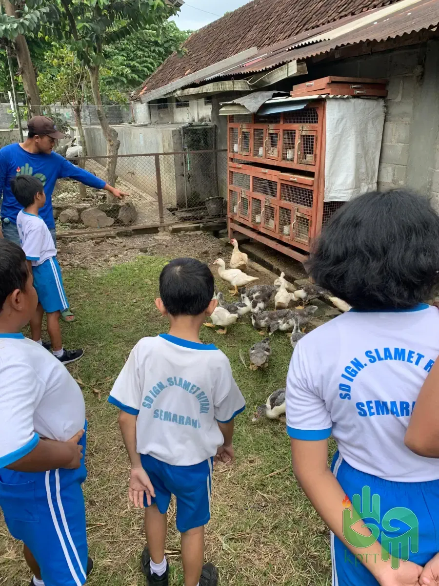 Setelah itu, teman-teman diajak berkeliling Area 1 KPTT Salatiga, melihat green house, tempat pembibitan tanaman, dan bahkan bertemu hewan-hewan ternak seperti sapi, ayam, bebek, dan kambing. Tidak hanya melihat, mereka juga senang sekali saat memberi makan langsung hewan-hewan tersebut.